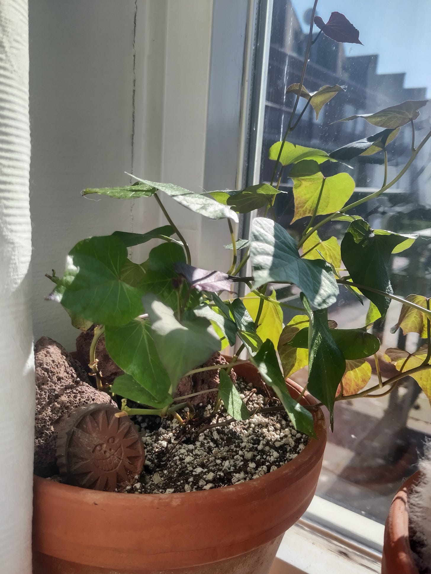 - And for a wee bit of cultivated hope: our sweet potato vine. A forgotten sweet potato, shriveled and moldy, now eagerly and beautifully reaching toward the sun. What else would thrive with just a bit of (metaphoric) soil and light?