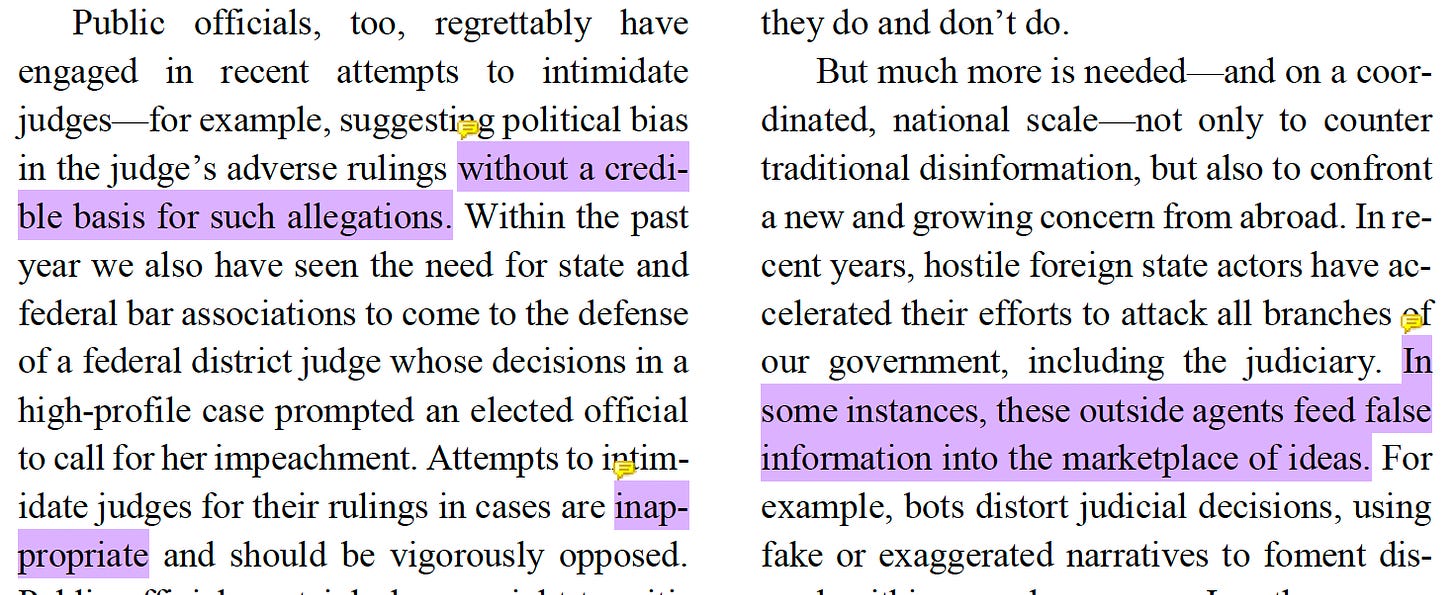 Calling judicial independence “crown jewels” evokes a monarchical imagery. For adherents of originalism and textualism—terms fraught with ironies and contradictions themselves—such treasures symbolize authority, continuity, and national heritage. Roberts stresses this idea, writing, “Hamilton anticipated that the relatively weak judicial branch—possessing neither the sword nor the purse—would require 'all possible care . . . to defend itself' against the attacks of the other branches” (3). Later in the report, Roberts extends this argument, condemning critiques from politicians “suggesting political bias in the judge’s adverse rulings without a credible basis for such allegations” (7). However, this stance appears inconsistent with his earlier insistence that the judiciary is open to informed criticism, as long as he need not directly address it.