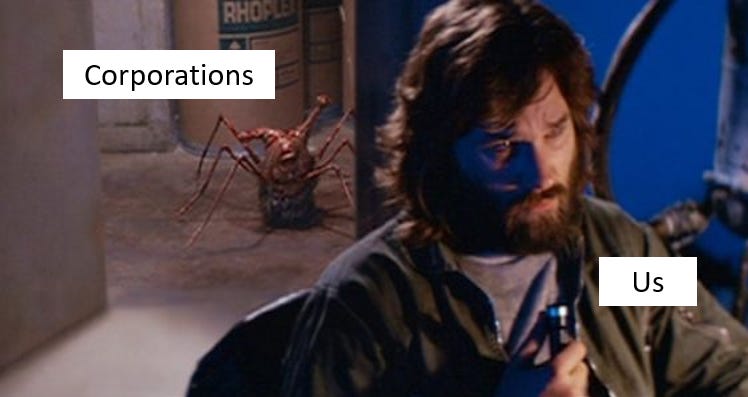 The literalization of the corporate personhood metaphor may encourage individuals to attempt to address corporate harm as if corporations were actual people. Regardless of the cultural symbolic heft killing a CEO may have, beheading a corporation doesn’t work. Despite all of the body metaphors in corporate speak (talking about their brains, hearts, and backbones, for instance), corporations are not people. They are not bound by the physical limitations we are. They replace their “heads” and “hearts” with little effect on their overall “health”.