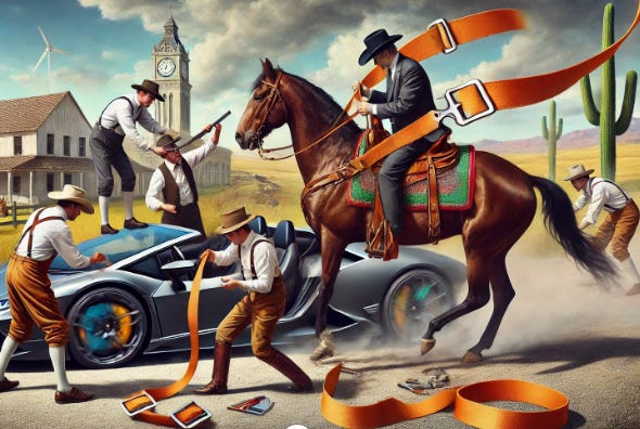 - The following absurd image from Brigitte Nerlich, inspired by a quote in the NYT framing the pitiful attempts at AI regulation as “policymakers on horseback, struggling to install seatbelts on a passing Lamborghini.”
